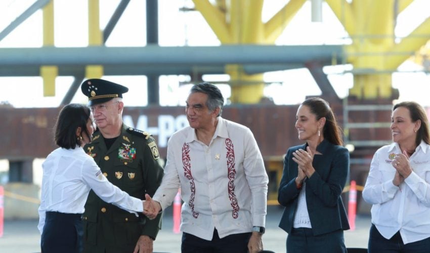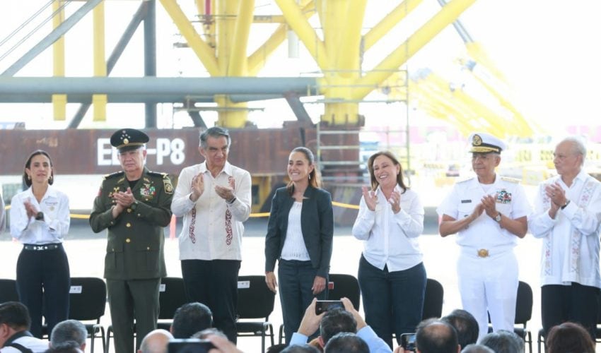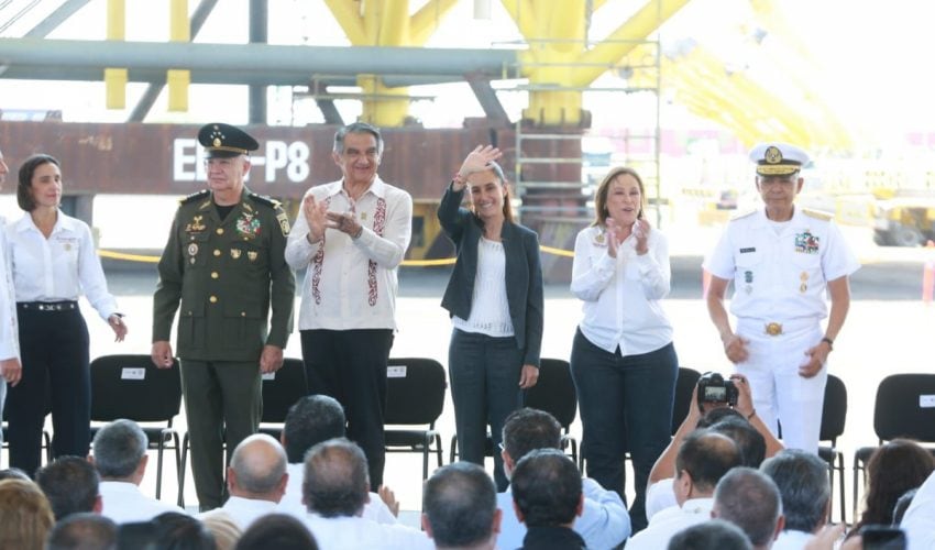 Durante el evento celebrado en el Patio Industrial de Pueblo Viejo, Veracruz, y junto a la gobernadora anfitriona Rocío Nahle García, al pie de las nuevas plataformas petroleras marinas construidas por Petróleos Mexicanos, la presidenta Claudia Sheinbaum destacó la presencia de Américo Villarreal, a quien consideró «un hombre nacionalista y visionario».