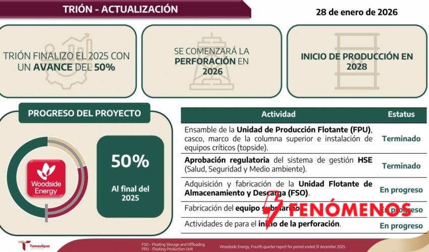 Ciudad Victoria, Tamaulipas.- La empresa Woodside Energy informó que, al cierre del año 2025, cuenta con un avance del 50% del Campo Trion, el cual se desarrolla frente a las costas tamaulipecas, considerado el primer campo petrolero de aguas profundas en México.