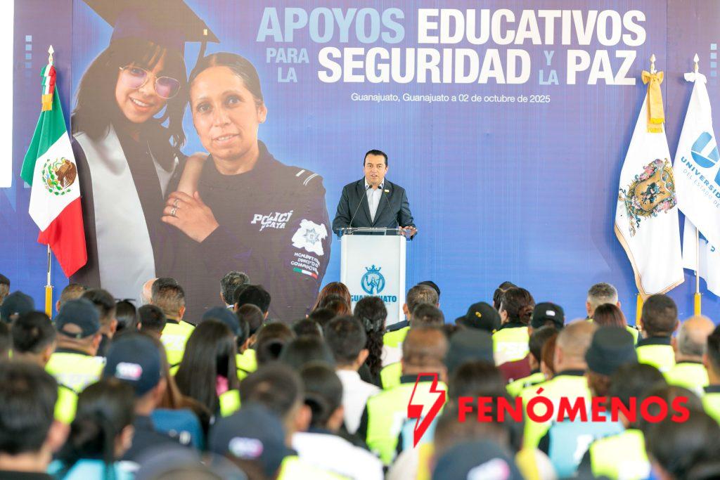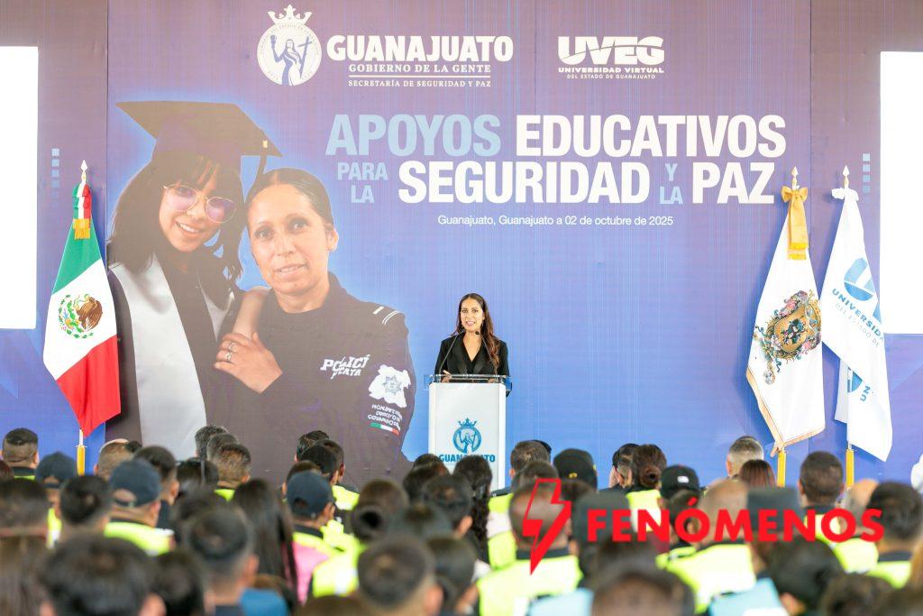 Guanajuato, Gto. 02 de octubre de 2025.- “Lo digo con mucho orgullo, este día es un parteaguas porque por primera vez, la Secretaría de Seguridad abre con tanta fuerza la puerta a la educación de quienes nos cuidan”, dijo la Gobernadora Libia Dennise García Muñoz Ledo, al anunciar Apoyos Educativos para elementos de la Secretaría de Seguridad y Paz y sus hijas e hijos.
