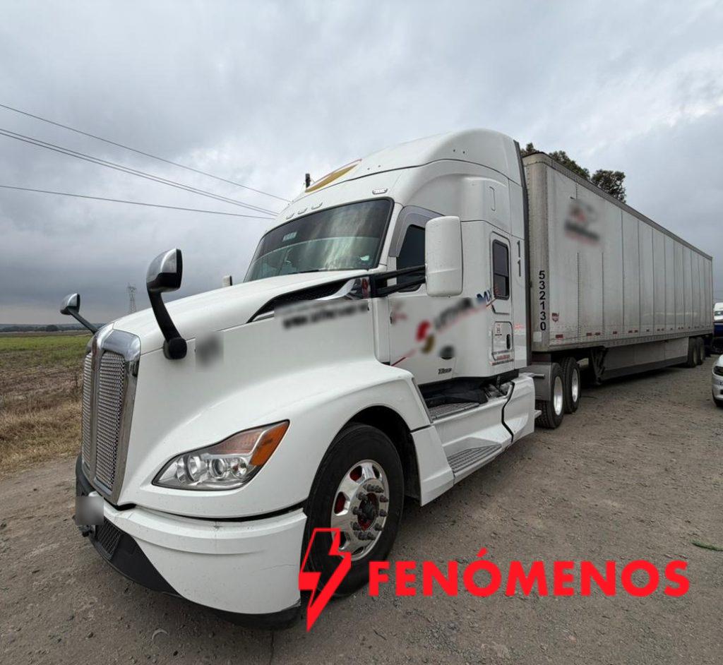 En el sitio, el personal operativo tuvo contacto con un tractocamión marca Kenworth, modelo 2023, acoplado a un semirremolque marca Wabash, modelo 2021, color blanco, con placas del estado de Maine, Estados Unidos.