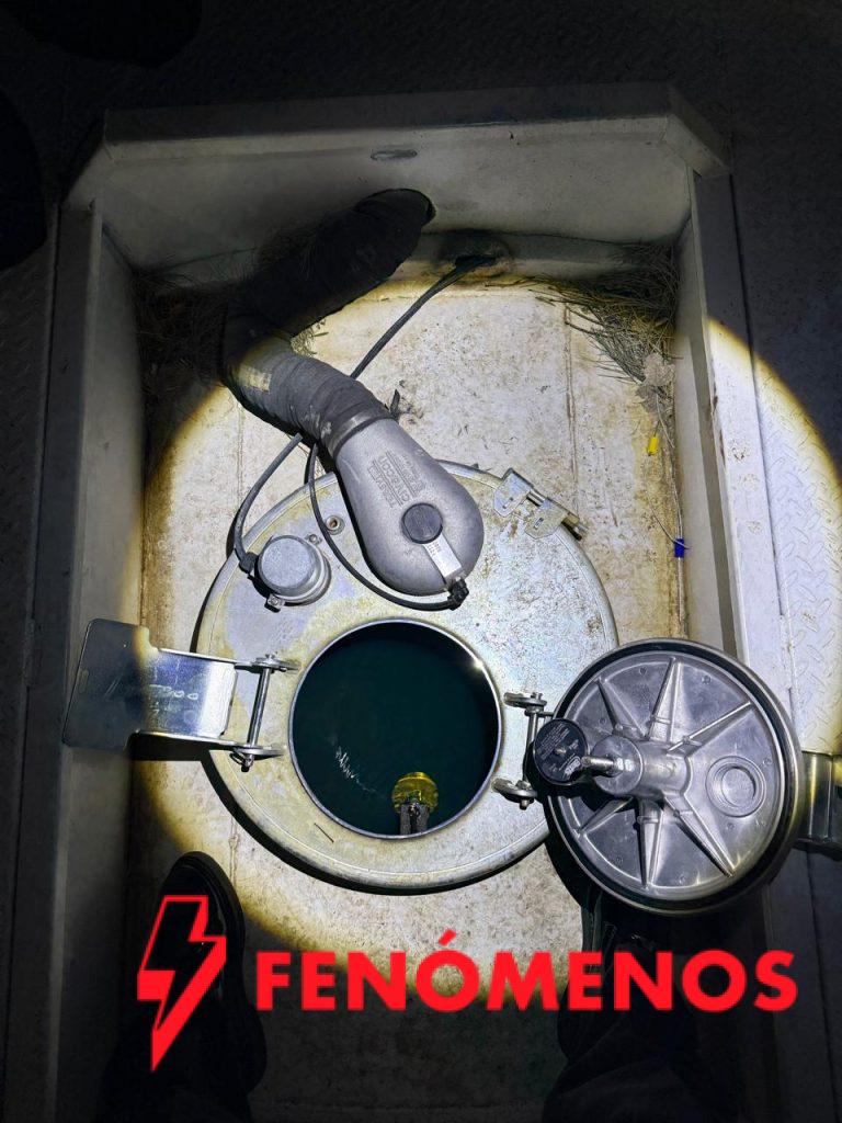Al inspeccionar el vehículo, un tractocamión tipo pipa marca Freightliner, modelo 2015, color blanco, con placas del Servicio Público Federal, se detectaron diversas irregularidades: ausencia de razón social visible y de sellos de seguridad, fuga en una de sus escotillas laterales y la escotilla superior completamente abierta.