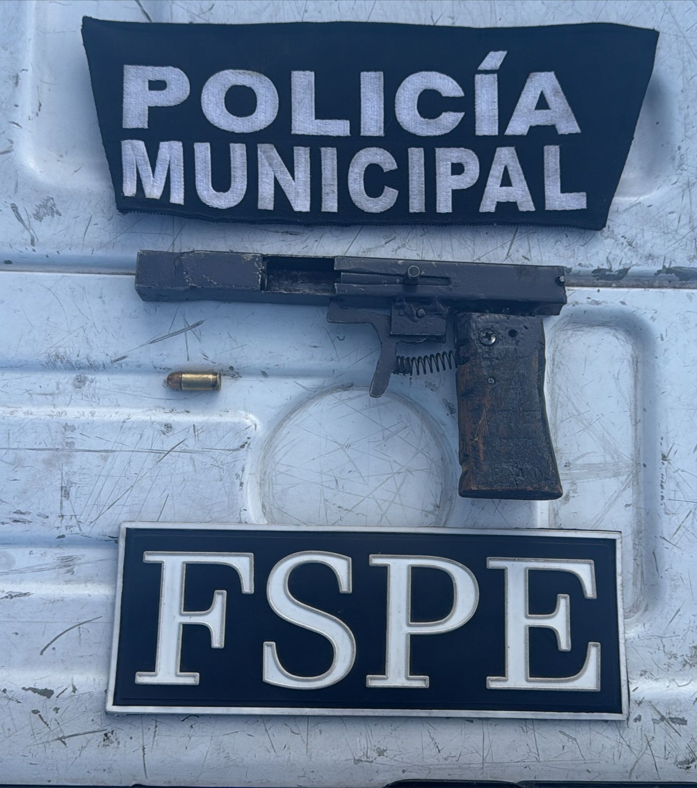 Durante la inspección de la camioneta con placas del estado de Chihuahua, fue localizada un arma de fuego corta de fabricación artesanal, calibre .380 mm, con un cartucho útil en la recámara.