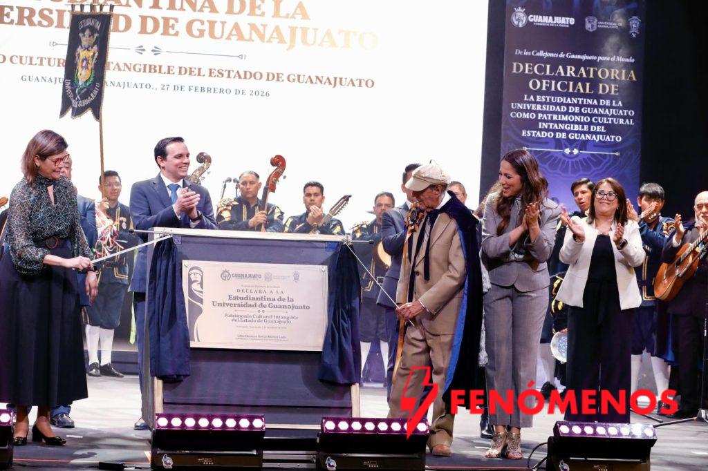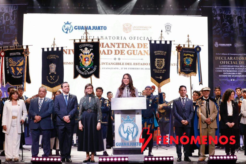 Guanajuato, Gto. 27 de febrero de 2026.– “Cada rincón de Guanajuato evoca cosas maravillosas y no se podría entender la historia de una ciudad como ésta, de una capital como la nuestra, sin la Estudiantina de la Universidad de Guanajuato”, expresó la Gobernadora de la Gente, Libia Dennise García Muñoz Ledo, en la ceremonia de Declaración de Estudiantina de la Universidad de Guanajuato como Patrimonio Cultural Intangible del Estado de Guanajuato.