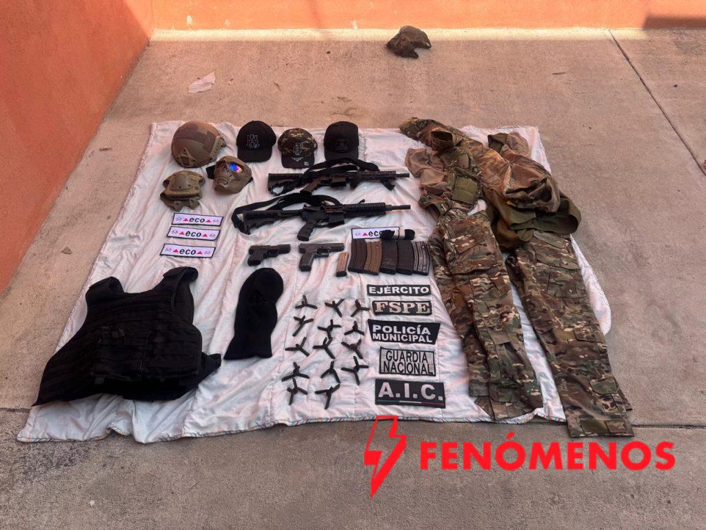 - Fueron aseguradas armas largas y cortas, posibles drogas, teléfonos celulares, un vehículo y equipo táctico con insignias de un grupo delictivo.