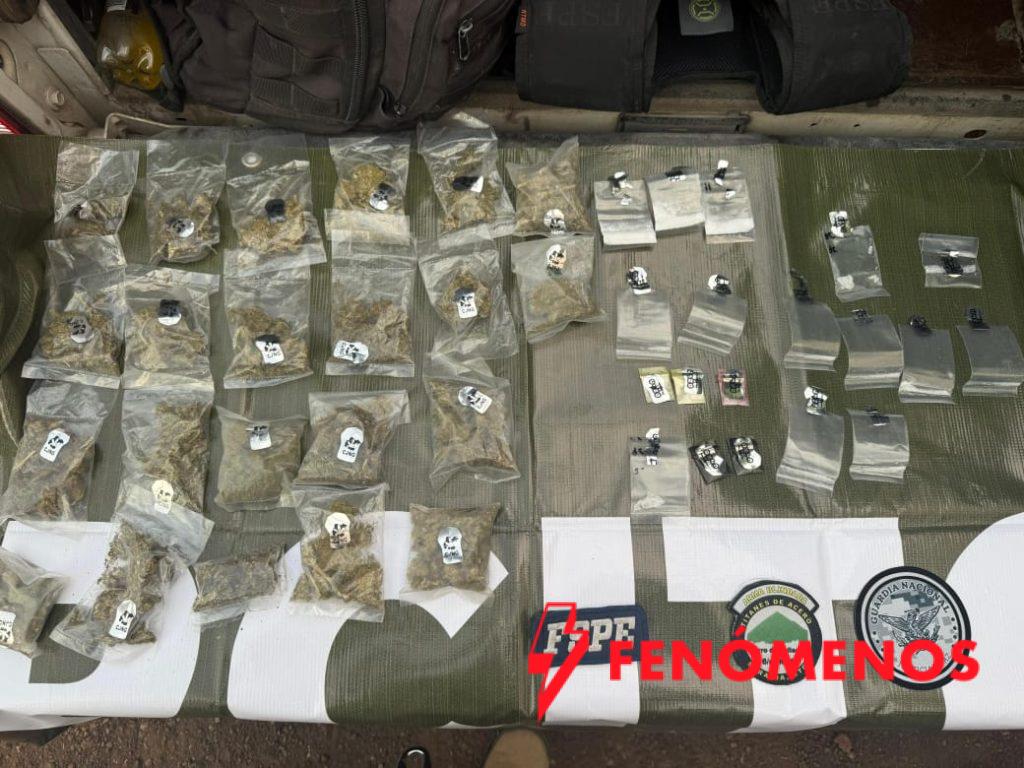 Se le dio alcance en el mismo punto para realizar una inspección preventiva, localizando en una mochila color azul con negro 22 bolsitas con marihuana, equivalente a 196 dosis; 5 bolsas con cocaína, equivalente a 12 dosis; y 14 envoltorios con cristal, equivalente a 30 dosis.