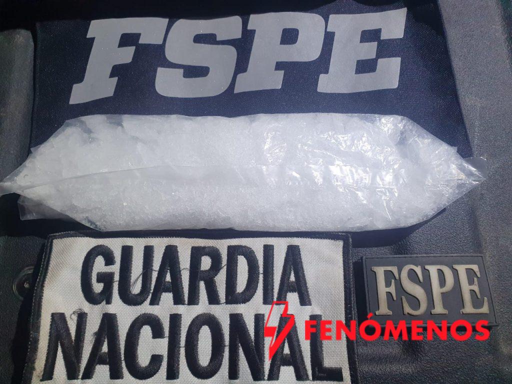 Luego de efectuar una inspección preventiva, se le aseguró una bolsa plástica que contenía una sustancia granulada (presunto cristal) con un peso aproximado de 182 gramos, equivalente a las 548 dosis. Además, se le localizó un chaleco táctico color negro, sin placas balísticas y se aseguró un vehículo Nissan Tsuru.