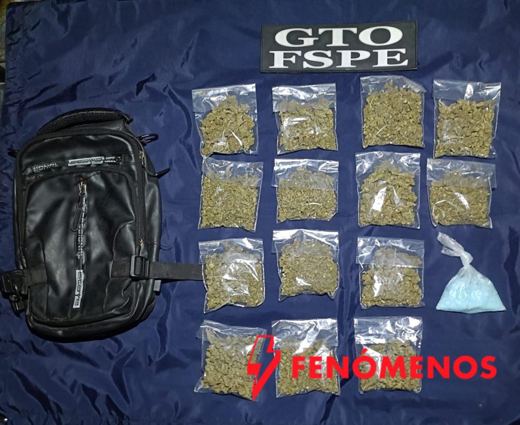 Posteriormente, gracias a una llamada anónima al 089, se atendió un reporte por presunta venta de droga en la colonia Arroyo Hondo. En el sitio se detuvo a Víctor Manuel “N”, de 29 años, vecino de la misma colonia, a quien se le aseguró una bolsa que contenía una sustancia granulada azul similar al cristal, con un peso aproximado de 40 gramos, así como 14 envoltorios con hierba verde y seca con características de marihuana.