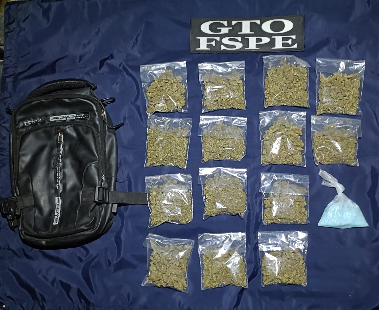 Posteriormente, gracias a una llamada anónima al 089, se atendió un reporte por presunta venta de droga en la colonia Arroyo Hondo. En el sitio se detuvo a Víctor Manuel “N”, de 29 años, vecino de la misma colonia, a quien se le aseguró una bolsa que contenía una sustancia granulada azul similar al cristal, con un peso aproximado de 40 gramos, así como 14 envoltorios con hierba verde y seca con características de marihuana.