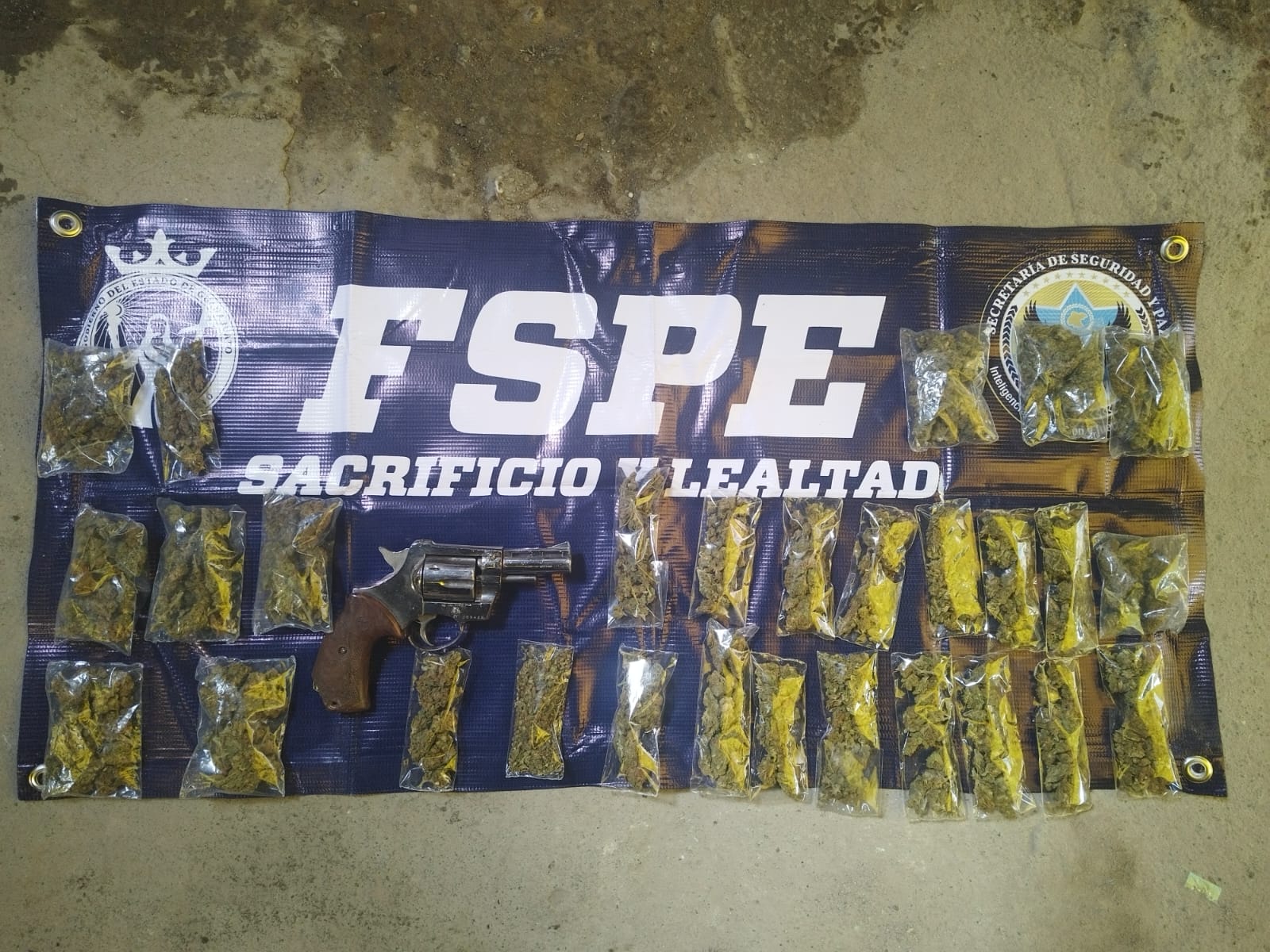 Durante la revisión se localizó, al interior de una mochila, 28 bolsas de presunta marihuana, con un equivalente aproximado a 200 dosis, así como un arma de fuego tipo revólver calibre .38 especial.