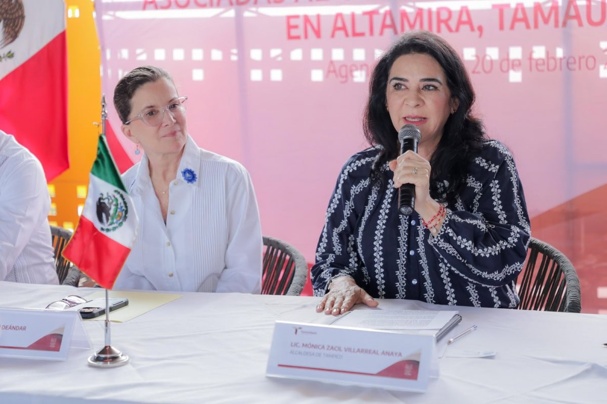 La secretaria de Economía, Ninfa Cantú Deándar, acompañada de la presidenta municipal de Tampico, Mónica Villarreal; de los alcaldes de Altamira, Armando Martínez;  y de Madero, Erasmo González; el secretario de Desarrollo Energético, Walter Julián Ángel; el jefe de Unidad de Comercio e Industria de CEPAL Nahuel Odonne; el presidente de AISTAC, Eliezer Garza y el presidente del CIEST, Marco Cortés sostuvieron en esta ciudad, un encuentro con los medios de comunicación para dar a conocer los alcances de esta estrategia conjunta.
