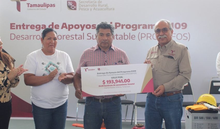 Ciudad Victoria, Tamaulipas.– Con el firme compromiso de fortalecer las capacidades de manejo, conservación y aprovechamiento sustentable de los ecosistemas forestales en el estado, la Secretaría de Desarrollo Rural, Pesca y Acuacultura, a través de la Subsecretaría de Desarrollo Pecuario y Forestal, llevó a cabo la entrega de apoyos correspondientes al Programa de Desarrollo Forestal Sustentable 2026.