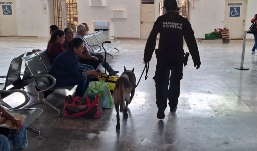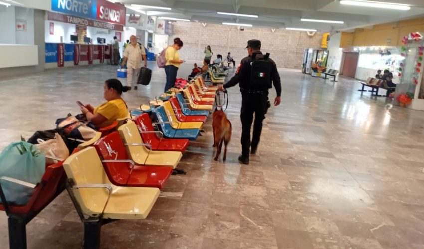 Ciudad Victoria, Tamaulipas.– Con el objetivo de reforzar la proximidad social y brindar mayor seguridad a las personas usuarias del transporte público, personal de la Guardia Estatal, a través del Agrupamiento Canino, realiza operativos de vigilancia en la Central de Autobuses de Ciudad Victoria.