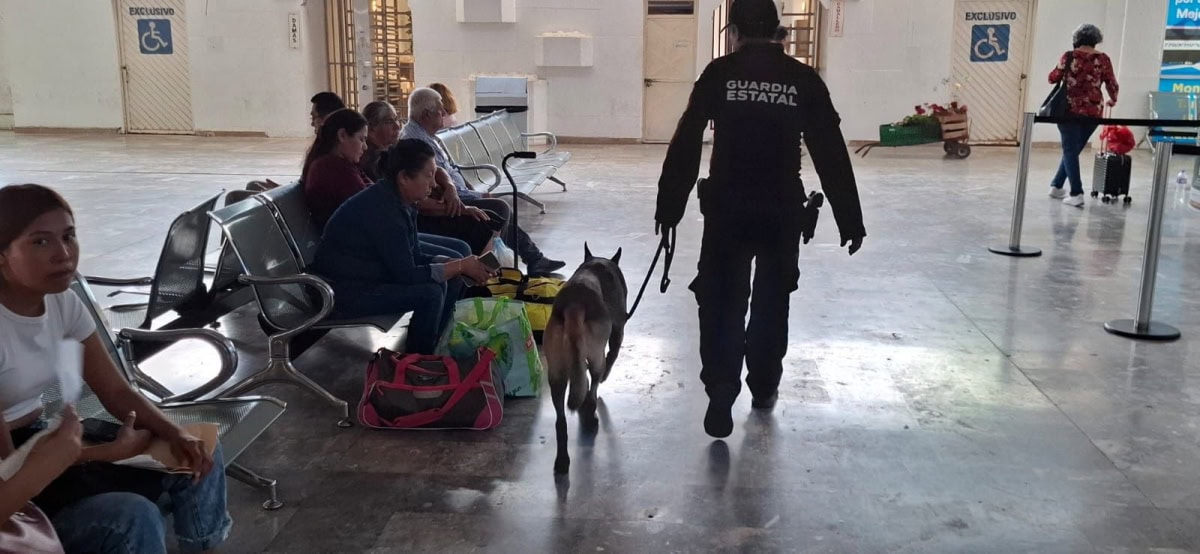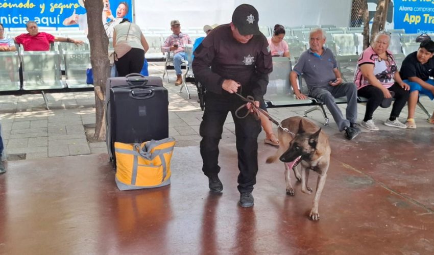 Durante la jornada, el binomio canino integrado por el ejemplar “Flash”, especializado en la detección de narcóticos, llevó a cabo recorridos de inspección en pasillos, salas de espera, andenes y áreas comunes de la terminal.