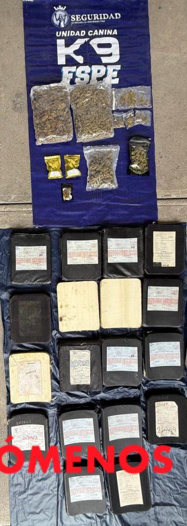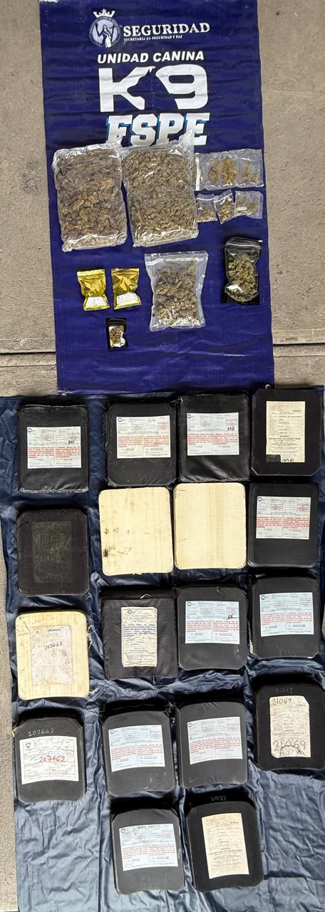 En el sitio, el oficial canino Oxi marcó de manera positiva siete paquetes, en cuyo interior fueron localizadas 1 mil 253 dosis de posible marihuana distribuidas en diversos envoltorios, así como 18 placas balísticas de uso exclusivo de instituciones de seguridad y Fuerzas Armadas.
