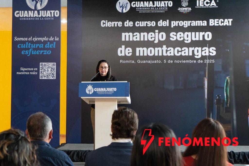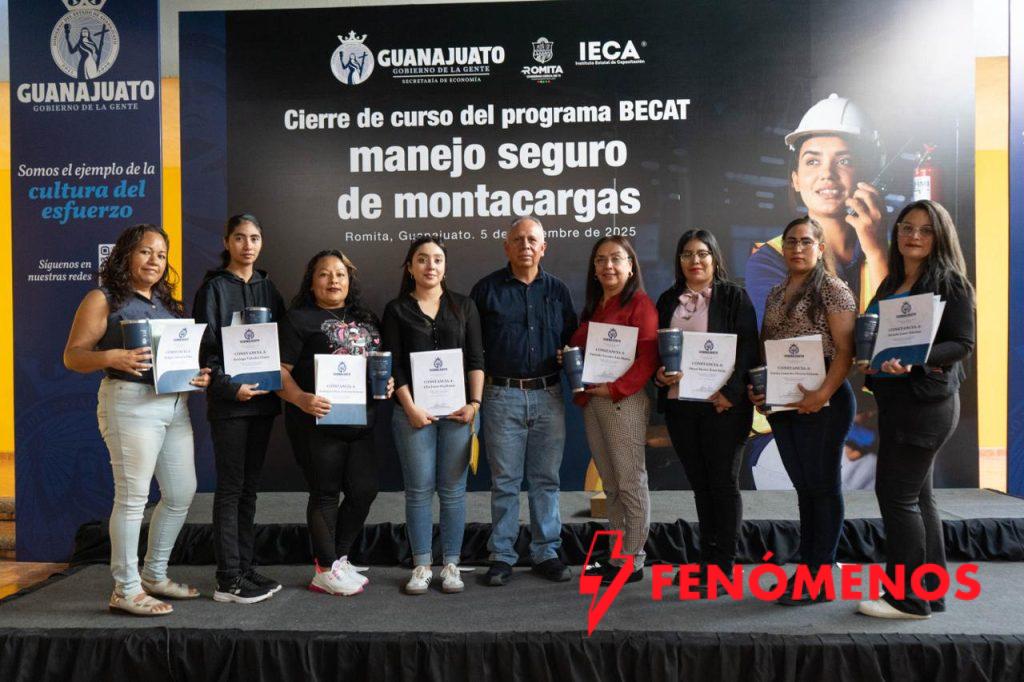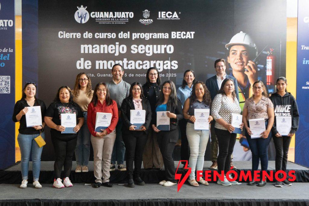 Romita, Gto., 6 de noviembre del 2025.- Guanajuato refrenda su compromiso con la igualdad de oportunidades laborales con la entrega de constancias a 13 mujeres que concluyeron la capacitación en Manejo Seguro de Montacargas.