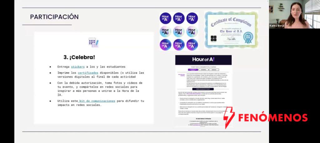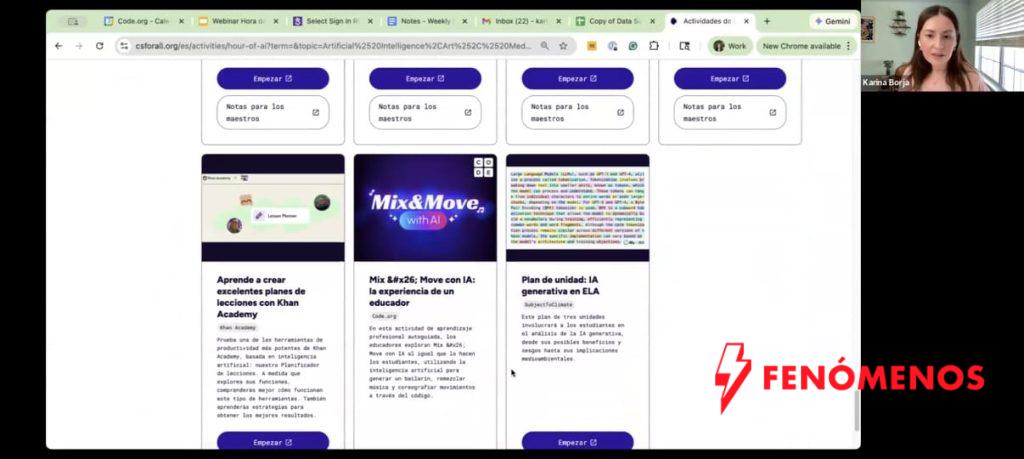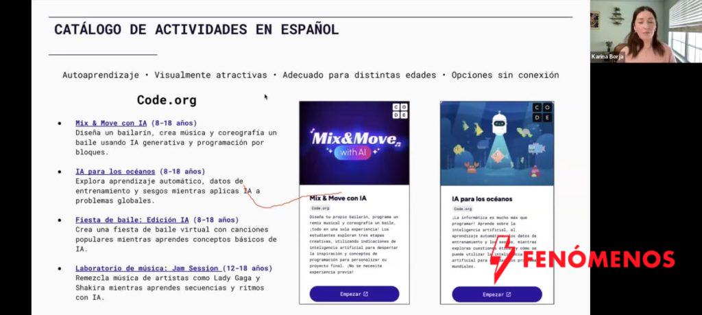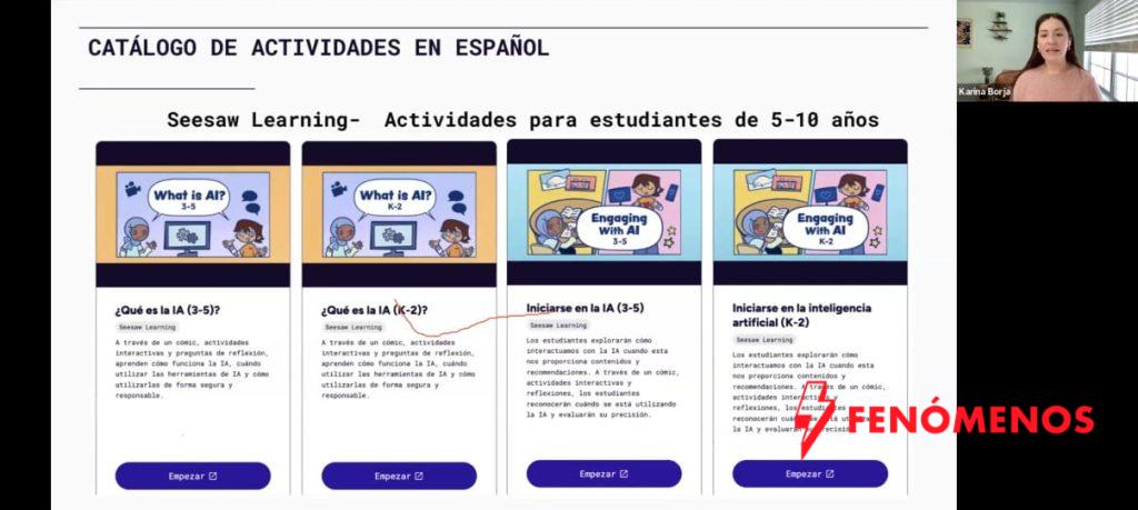 Durante la sesión se presentaron diversas actividades educativas gratuitas, diseñadas para estudiantes de diferentes edades, que permiten aprender sobre inteligencia artificial de manera práctica, interactiva y accesible.