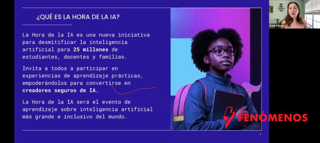 La conferencia fue impartida por Karina Borja, representante de la organización internacional Code.org, quien explicó que la campaña “Hora de la IA” surge como una evolución de la iniciativa “Hora del Código”, con el objetivo de desmitificar la inteligencia artificial y acercar su comprensión a estudiantes, docentes y familias.