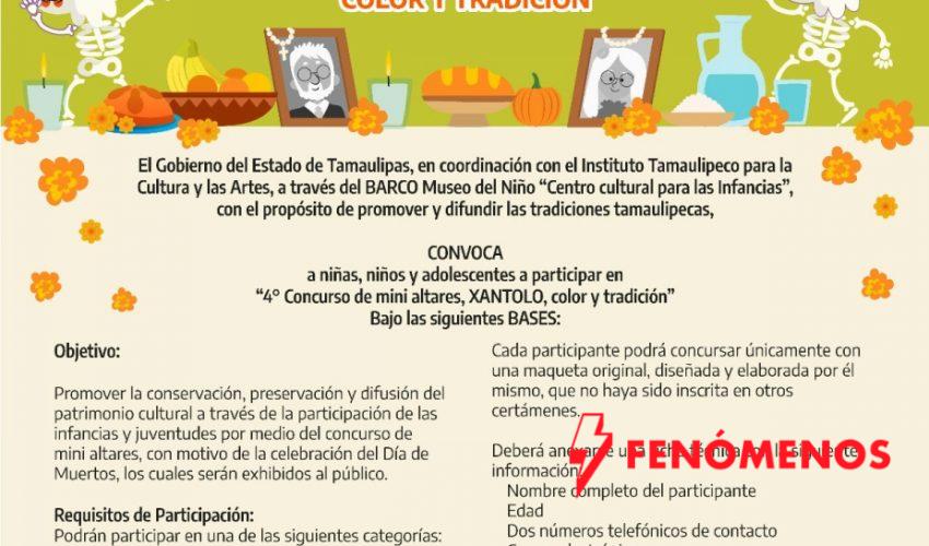 Tampico, Tamaulipas.-Para conmemorar el Día de Muertos, una de las celebraciones más emblemáticas de México; el Gobierno del Estado de Tamaulipas, a través del Instituto Tamaulipeco para la Cultura y las Artes y el centro cultural para las infancias BARCO, llevará a cabo una jornada de actividades culturales, artísticas y familiares en el sur del estado, por lo que invitan a las comunidades de Tampico y municipios cercanos a participar en las diversas actividades como el Concurso de Mini Altares.