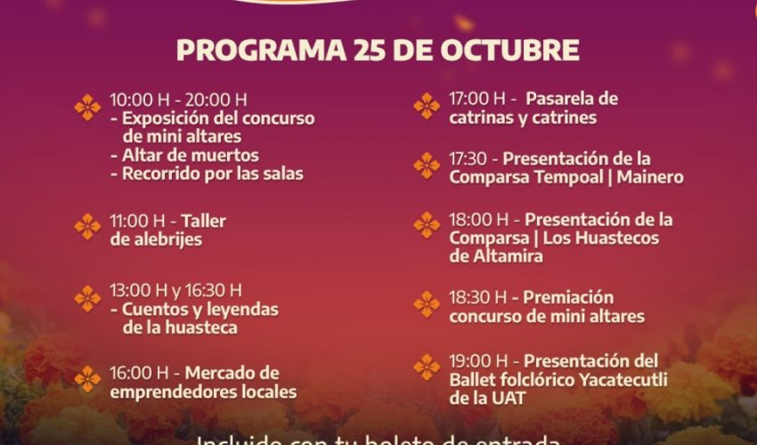 Será el próximo sábado 25 de octubre que se realizará el evento donde se exhibirán los mini altares, además de que habrá talleres, mercado local, cuenta cuentos y Pasarela de Catrinas y Catrines a las 17:00 horas, con atracciones para toda la familia.