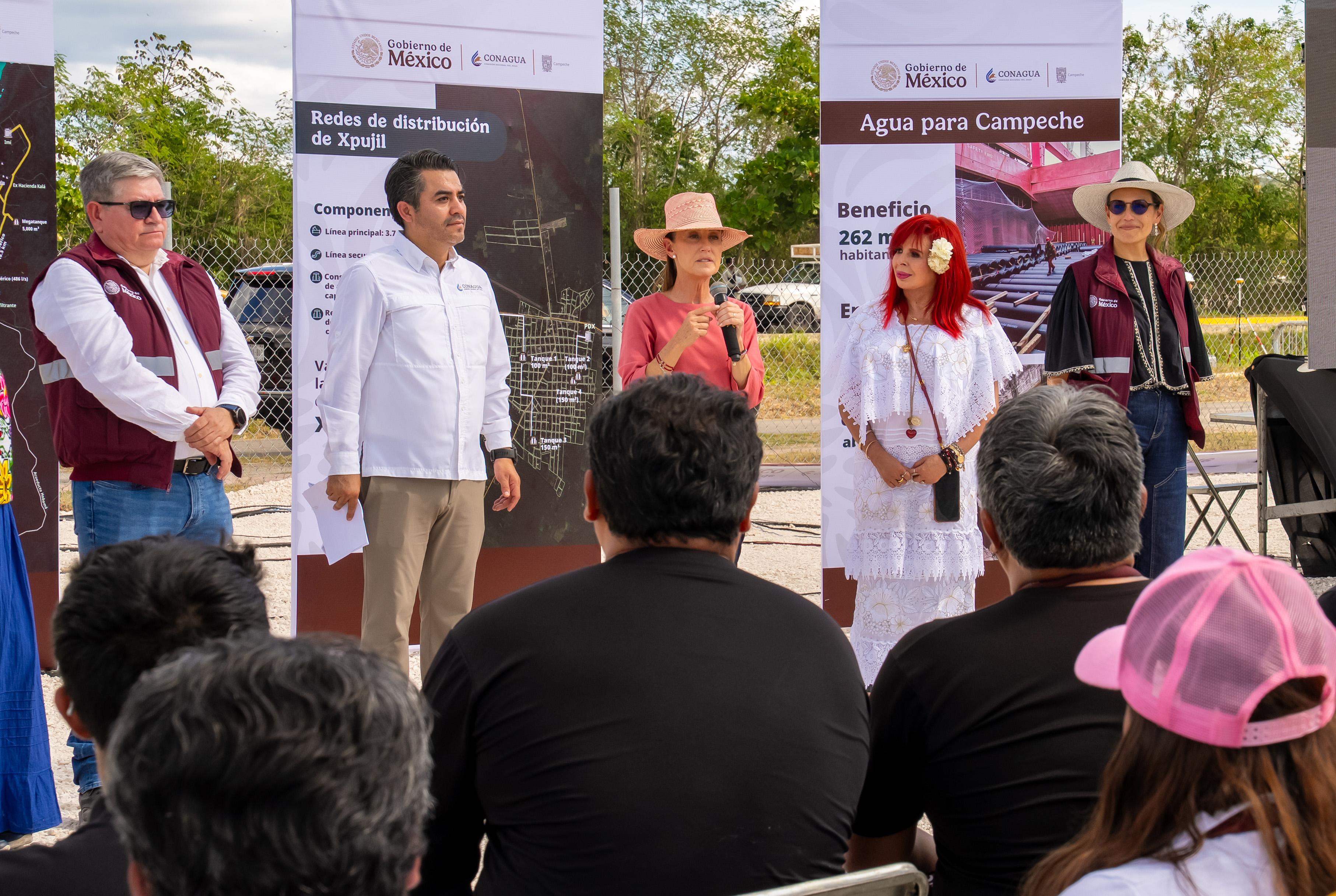 El evento se llevó a cabo en la localidad de Chiná, donde también participaron autoridades federales y estatales, junto con trabajadoras y trabajadores que tendrán a su cargo las labores de construcción y modernización del sistema hídrico.