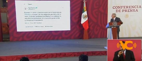 AMLO habla sobre el tweet del Papa Francisco, donde se lamenta por el homicidio de dos jesuitas en México.