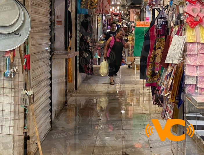 Minatitlán, Ver. Consecuencia de la falta de mantenimiento en techado y ausencia de desazolve en drenajes se registran filtraciones y encharcamientos en pasillos y locales del mercado “5 de Febrero” de la colonia Playón Sur, por lo que comerciantes hacen una vez más el llamado urgente a autoridades para tomar medidas al respecto.