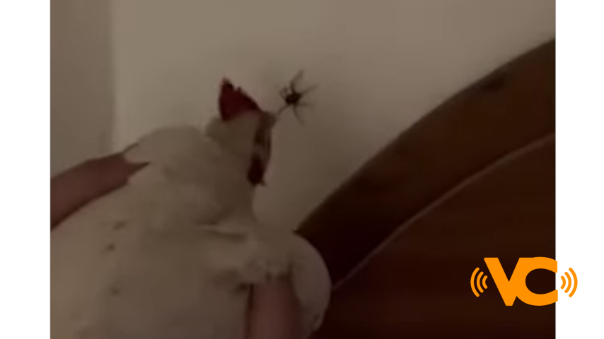 Mujer utiliza gallina para controlar las arañas en casa
