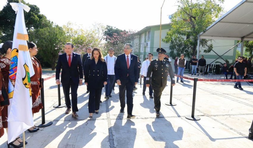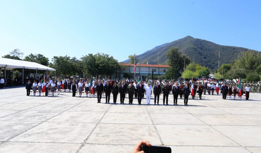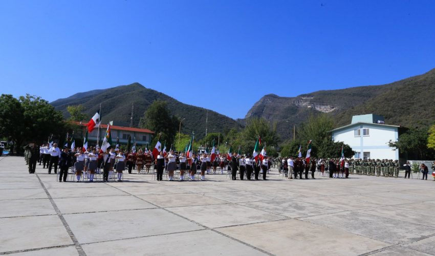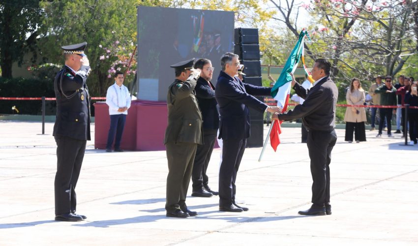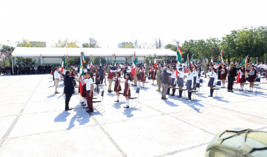 Durante el evento cívico, que incluyó un enlace con la ceremonia encabezada por la presidenta Claudia Sheinbaum Pardo, y en el cual también se izó la bandera del Cerro del Aura, el mandatario estatal, quien hizo entrega del lábaro patrio para su guarda y custodia a cinco escuelas, reafirmó el compromiso de las nuevas generaciones con los valores y símbolos patrios.