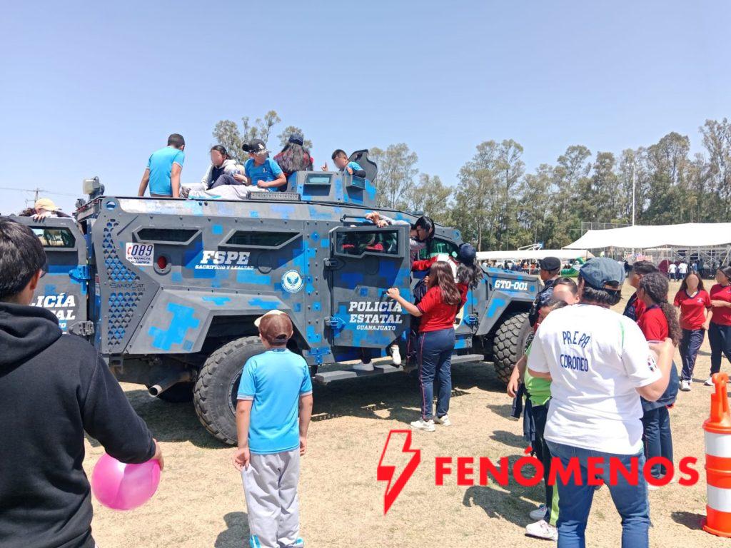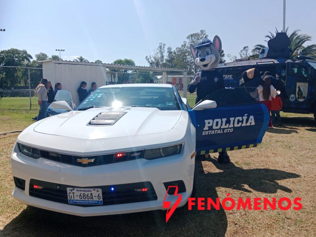 Guanajuato, Gto., 28 de abril de 2026.-Acercarse a un oficial de policía, conocer los números de emergencia y hasta subirse a una patrulla fueron las actividades que vivieron las y los ciudadanos de Coroneo en la Feria de Proximidad Policial.