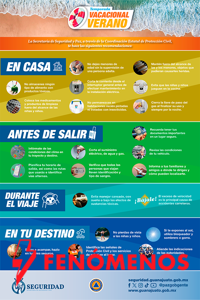 - La Secretaría de Seguridad y Paz del Estado de Guanajuato comparte recomendaciones para que durante este verano las vacaciones transcurran con responsabilidad y prevención.