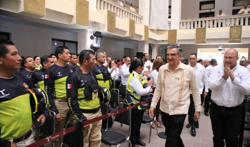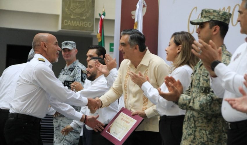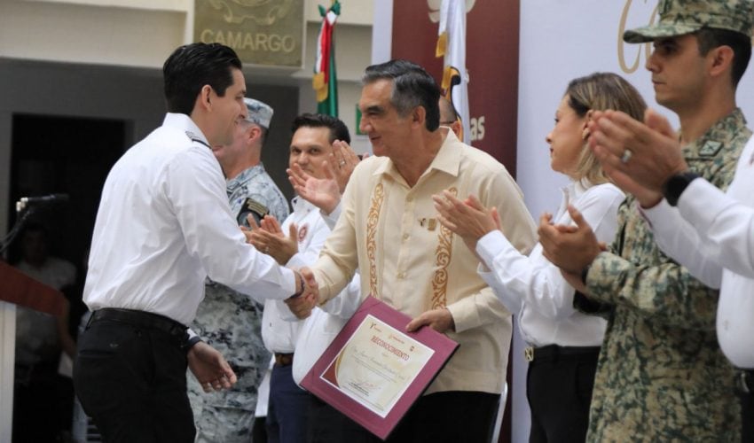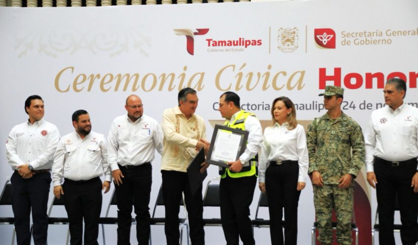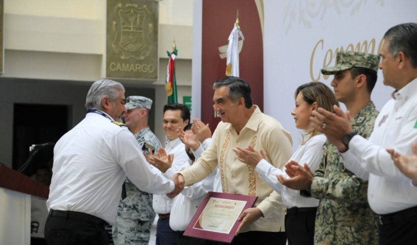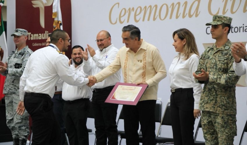 Tras la proyección de un video donde la directora de Protección Civil de Veracruz, Guadalupe Osorno, a nombre de la gobernadora Rocío Nahle da un reconocimiento al pueblo de Tamaulipas, por las labores de auxilio prestadas, el mandatario entregó litografías enviadas por la gobernadora al capitán Marcelo Israel Peña y al técnico auxiliar Fidel Eduardo Castro.