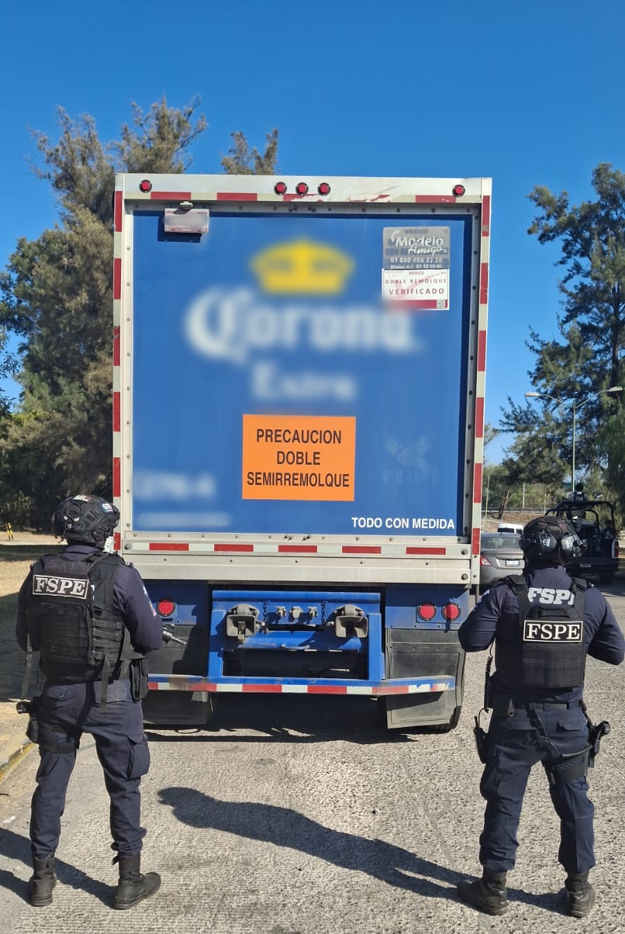 Como parte de las acciones permanentes de la estrategia estatal Coordinación Operativa de la Nueva Fuerza de Inteligencia Anticrimen (CONFIA), personal operativo realizaba patrullajes en la zona industrial cuando detectaron el vehículo con caja seca y logotipos de una empresa cervecera.