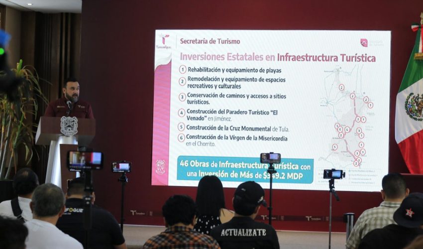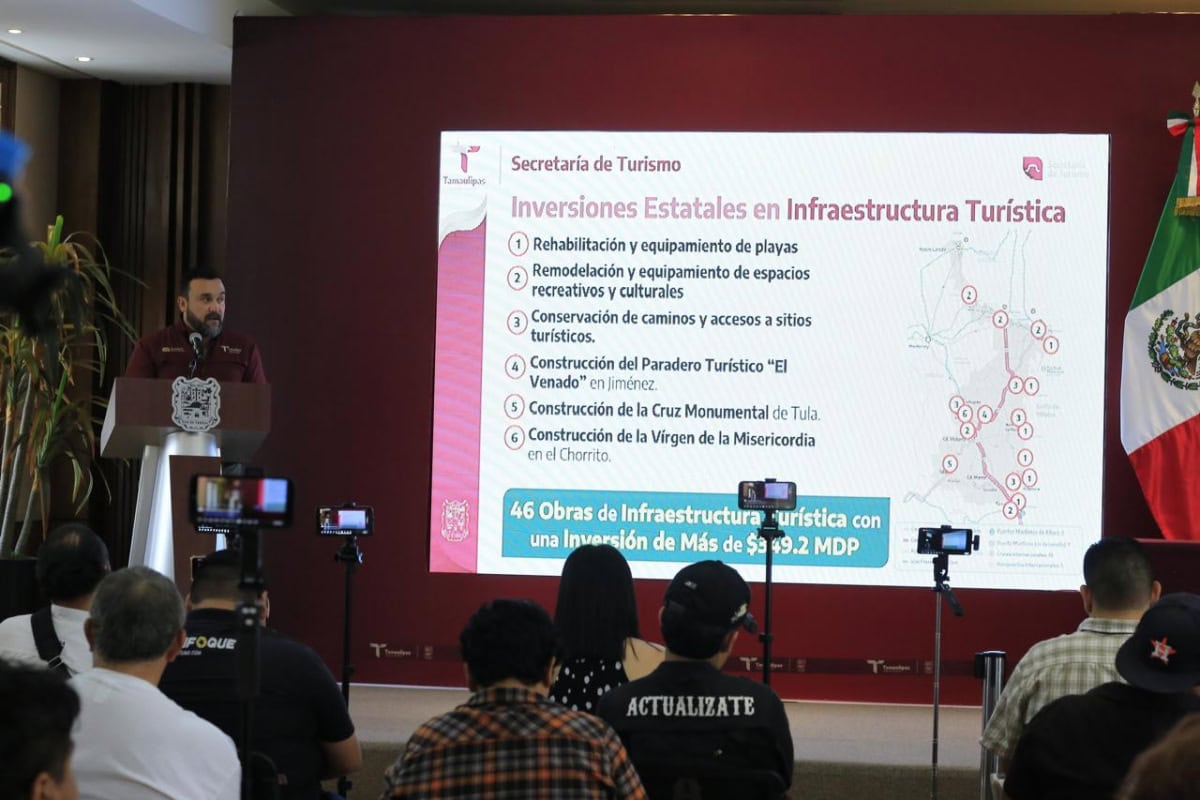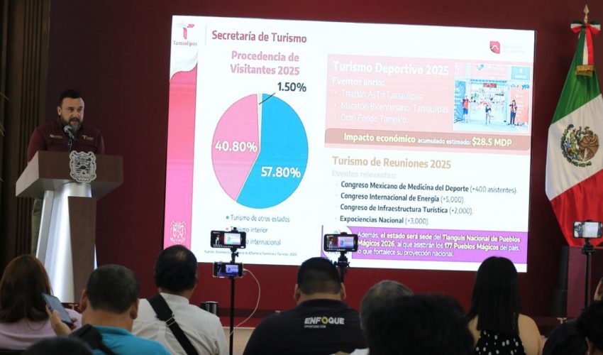 En la conferencia de prensa, el secretario de Turismo, Benjamín Hernández Rodríguez destacó que en los últimos tres años se ha logrado la consolidación turística de Tamaulipas con liderazgo nacional, hasta registrar una afluencia histórica en 2025 de 17.4 millones de visitantes; 3.2 millones superior respecto a 2024, lo que permitió generar una derrama de más de 16 mil MDP, un 24 por ciento respecto al año anterior.