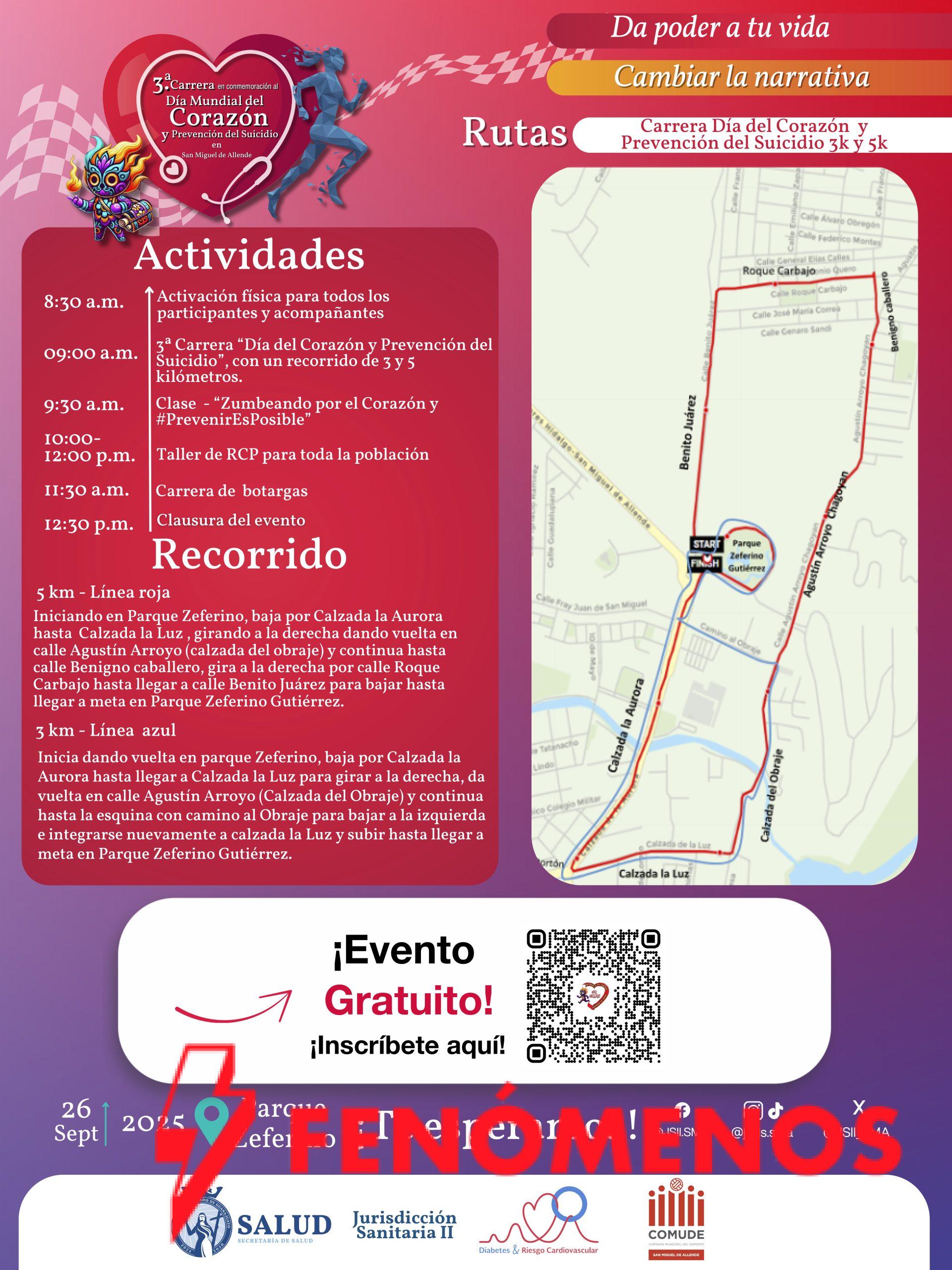 Con el objetivo de fortalecer la prevención de enfermedades y promover estilos de vida saludables, la Comisión Municipal del Deporte y la Jurisdicción Sanitaria II, a través de los programas de Enfermedades Cardiometabólicas y Salud Mental, invitan a la población a participar en la 3ª Carrera en conmemoración del Día Mundial del Corazón y Prevención del Suicidio.