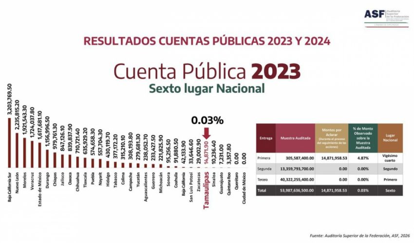Ciudad Victoria, Tamaulipas.- En el marco del Cuarto Informe de Gobierno, el gobernador Américo Villarreal Anaya destacó la fiscalización de la Cuenta Pública 2024 realizada por la Auditoría Superior de la Federación (ASF), donde se reportó un monto por aclarar de apenas el 0.02% del total fiscalizado, ubicando a Tamaulipas como uno de los estados que mejor desempeño tienen en la materia.